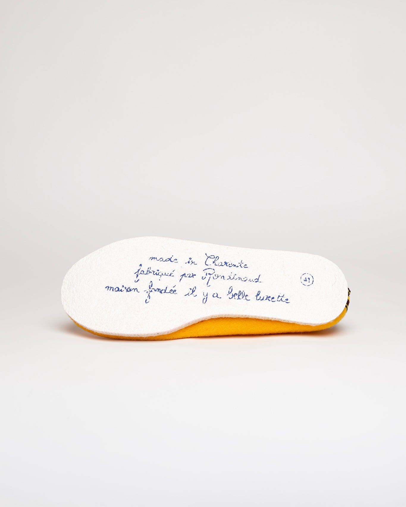 La charentaise DDP est fabriquée à la main en Charente selon la méthode ancestrale du cousu-retourné développée par Rondinaud. Conçue entièrement en laine véritable, intérieur comme extérieur, elle offre un confort incomparable et une excellente tenue dans le temps.