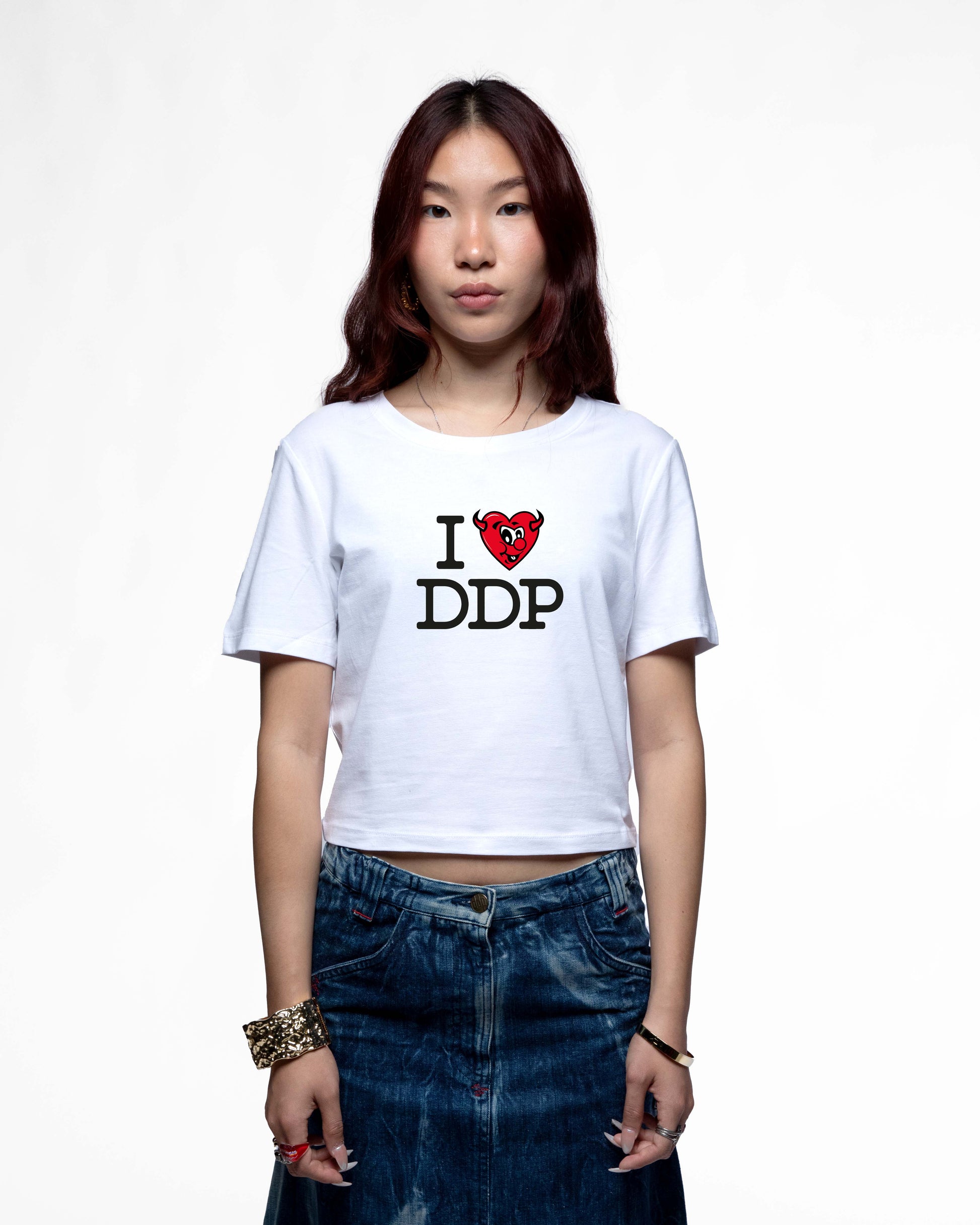 T-shirt crop top femme I LOVE DDP : un basique en coton léger coupe féminine, avec le visuel graphique I LOVE DDP sérigraphié.