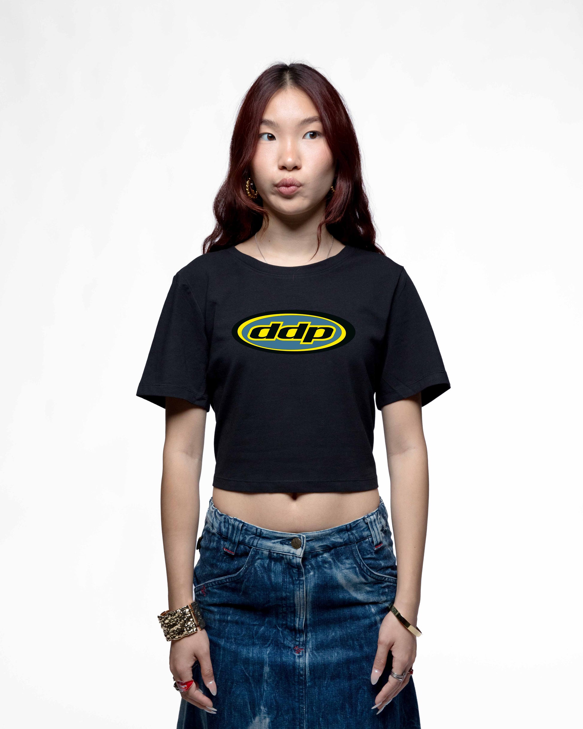 T-shirt crop femme cintré en coton 180 g/m². Longueur au-dessus du nombril. Design DDP95 imprimé en sérigraphie trois couleurs à l’avant.