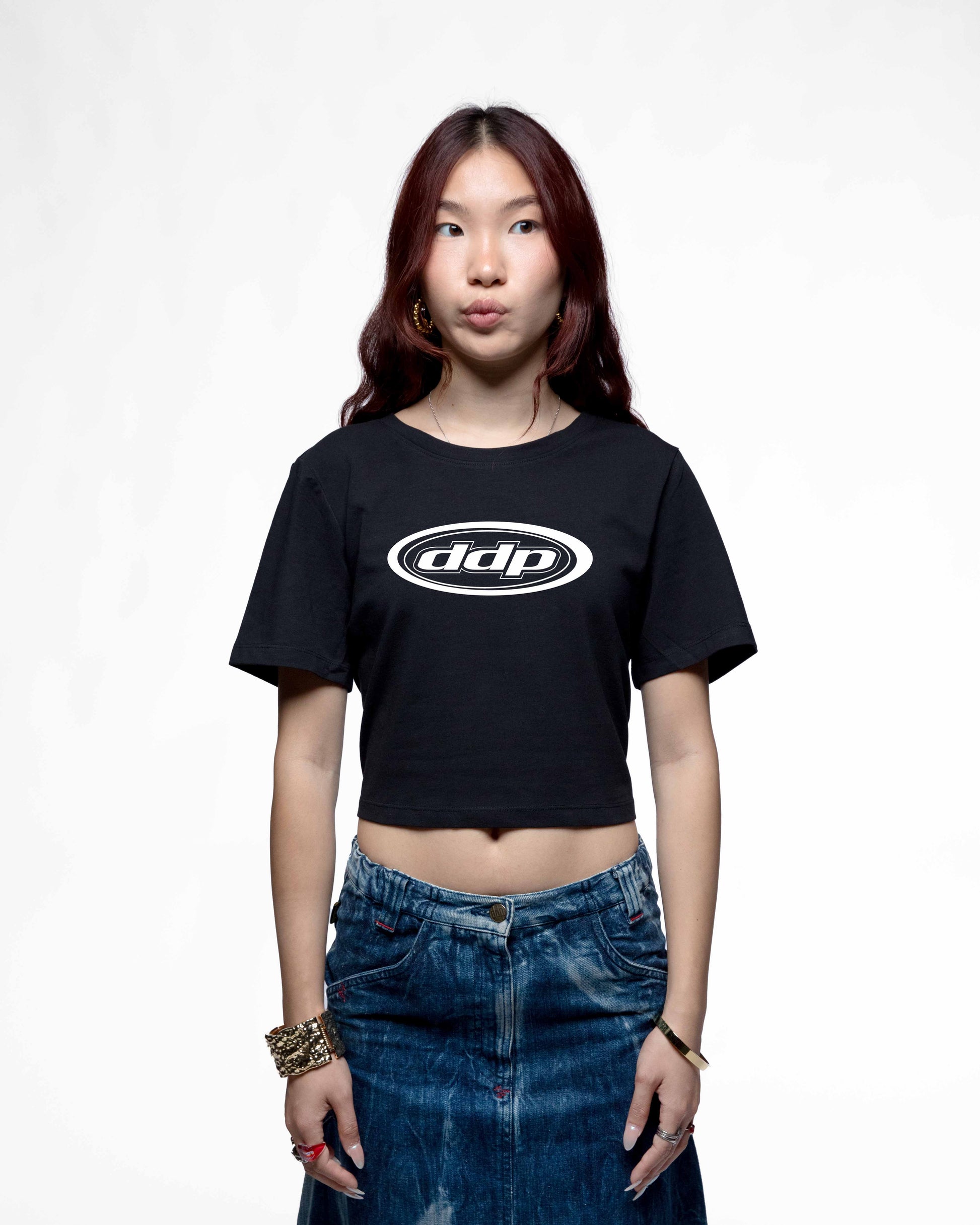 Crop tee femme DDP95 B&W : un t-shirt court cintré en coton, avec le logo DDP95 B&W imprimé à l’avant.