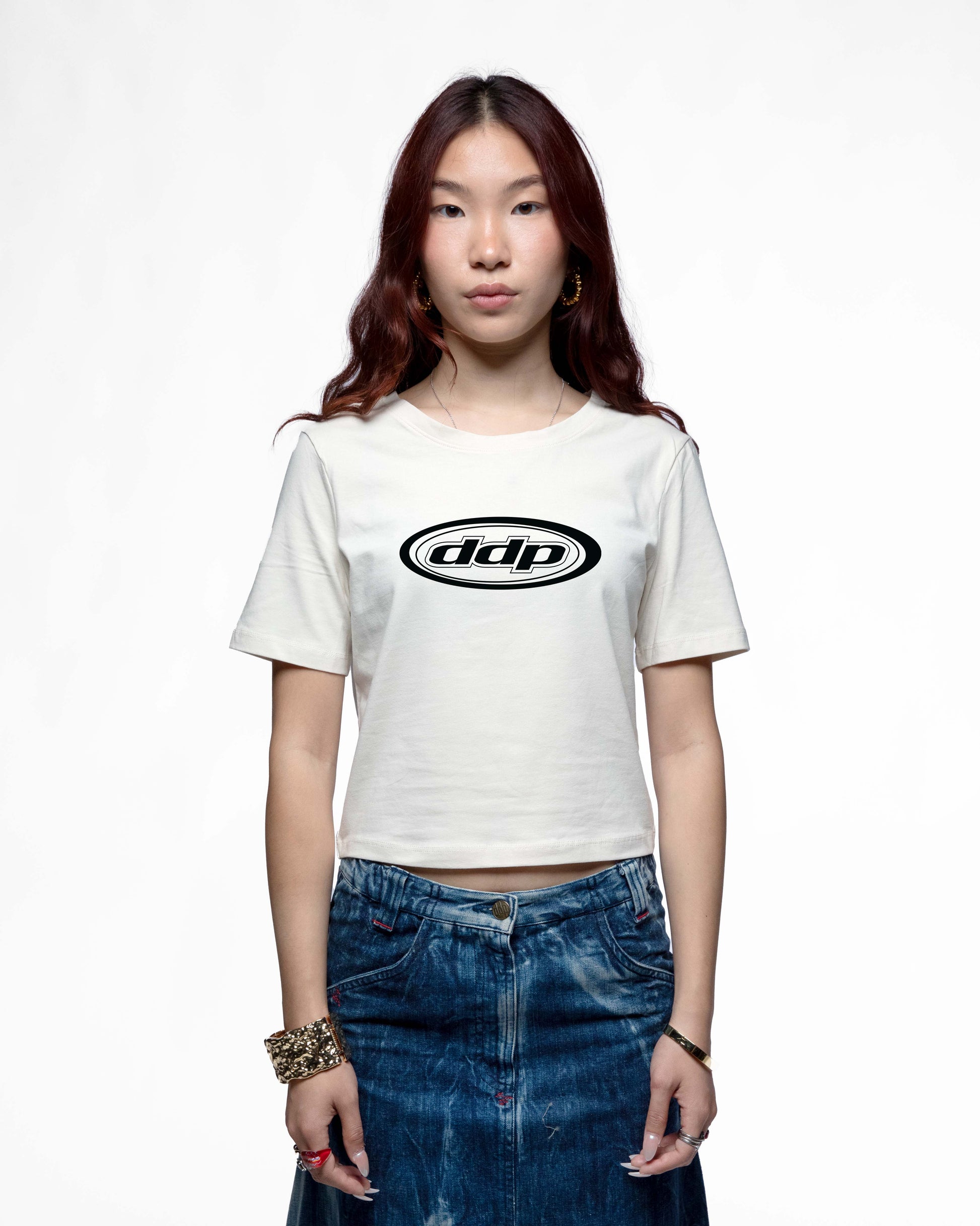 Crop tee femme DDP95 B&W : un t-shirt court cintré en coton, avec le logo DDP95 B&W imprimé à l’avant.