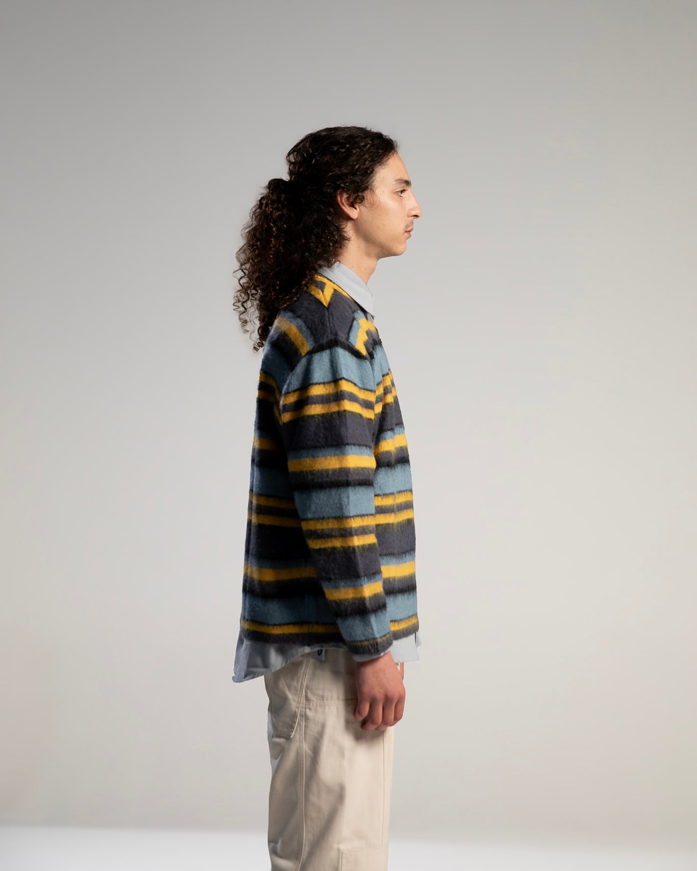 DDP Vintage Knitwear : un pull oversize en maille shaggy douce, orné du motif rayures iconique DDP issu des archives.