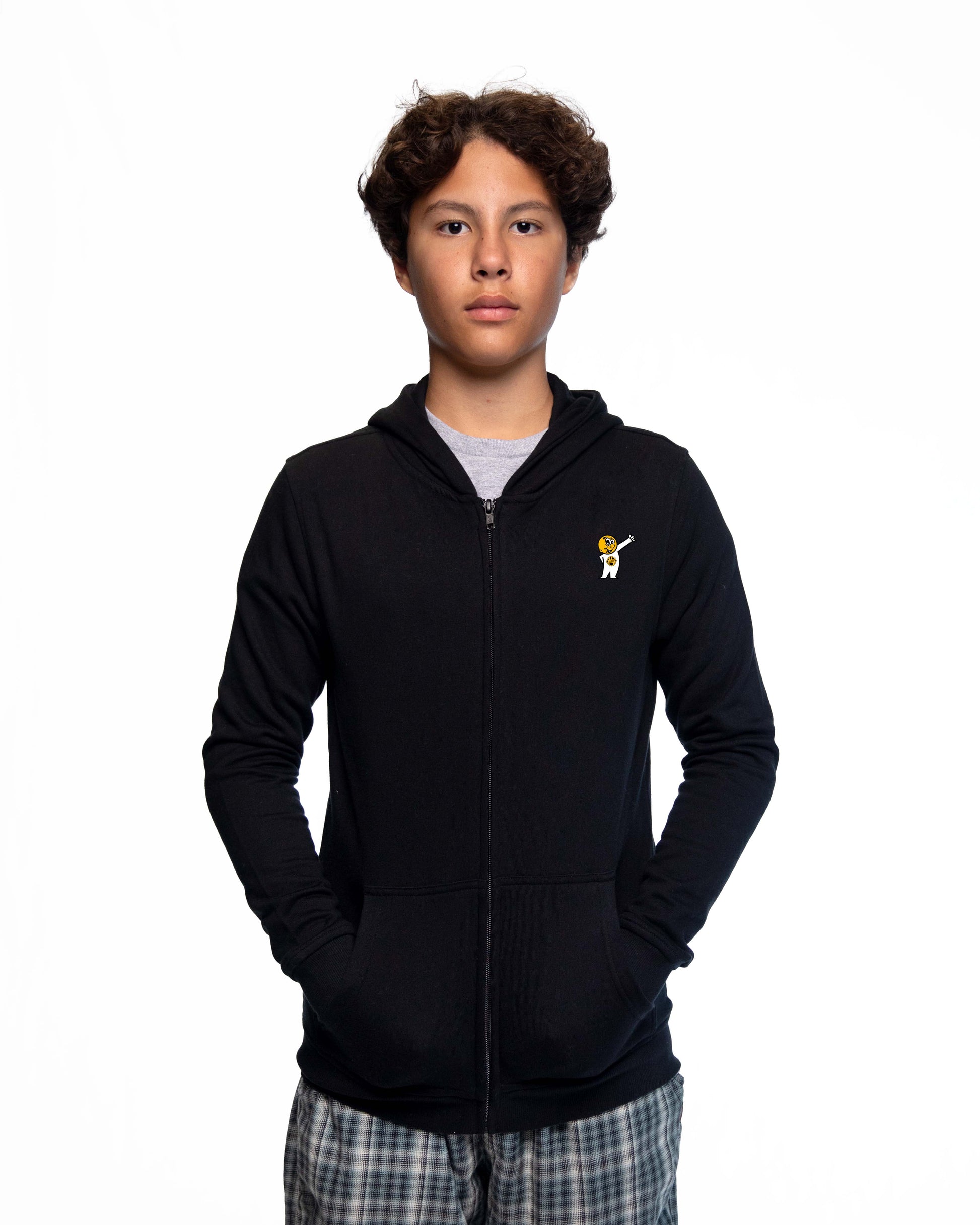 Hoodie zippé enfant Eggman95 en coton premium 400 g/m². Coupe droite confortable, capuche ajustable et fermeture zippée intégrale. Logo Eggman95 iconique appliqué en patch tissé. Disponible en plusieurs tailles et coloris.